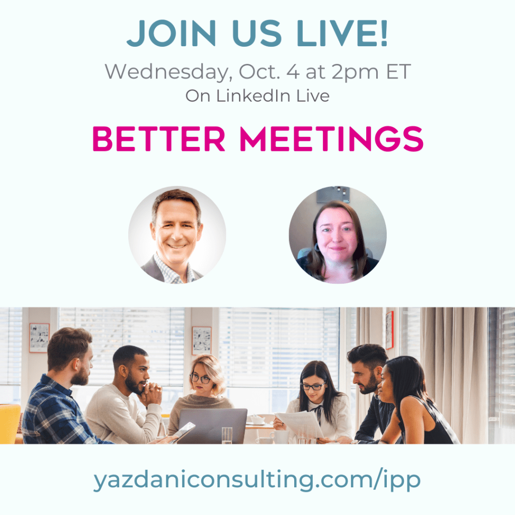 Meetings should be productive and have a purpose. Many times staff members dread meetings and would rather do anything but attend them. Please join me on October 4, 2023, on LinkedIn for a mini workshop hosted by Yazdani Consulting for some insights on how to rethink and rejuvenate your organization’s upcoming meetings.