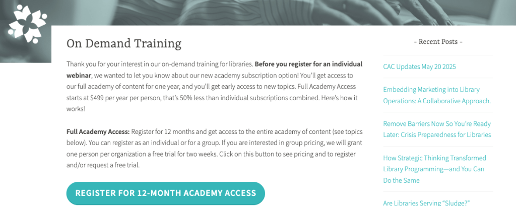 CAC Academy offers on demand training and you can sign up for the full CAC Academy access. When you register for 12 months, you get access to the entire academy of content (see website).